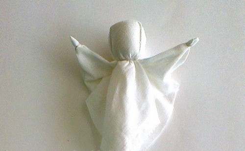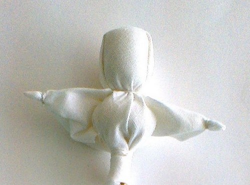 3. Формируем голову, закладываем мелкие складочки по бокам, чтобы лицо было гладкое без морщинок. Обматываем ниткой вокруг шеи, завязываем на два узелка, концы ниток обрезаем.