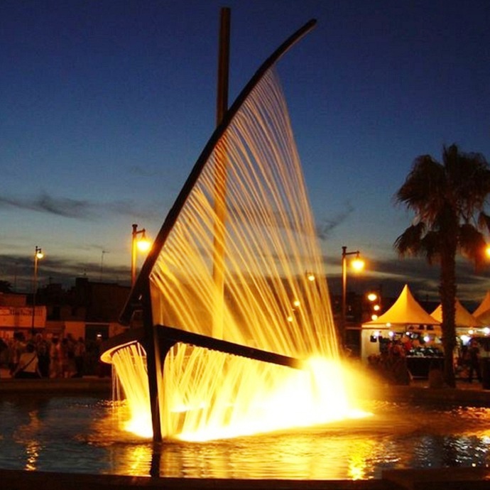 Великолепен Фонтан-лодка в Валенсии (Испания). Он расположен на площади Плайя-де-ла-Мальвароса в курортном городе Валенсия у самого Средиземного моря. Также его называют фонтан-парусник, он является достопримечательностью набережной Валенсии.