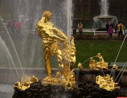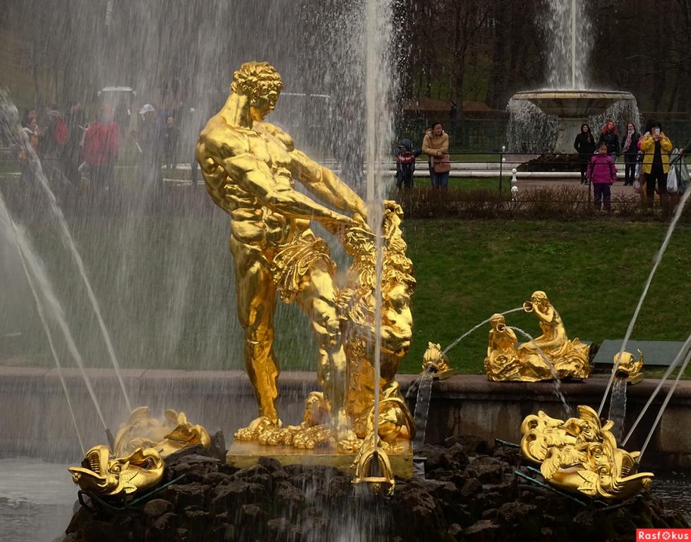 Фонтан «Самсон» на фоне Большого каскада и дворца. Такое название носит красивый фонтан, который стоит у подножья Большого каскада. Покрытая позолотой скульптурная композиция символизирует военную мощь России. Самсон, который разрывает пасть свирепого льва, давно считается визитной карточкой всего петергофского комплекса (фото 5).