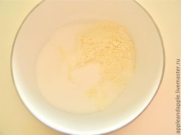 2. Пока вода закипает, в миске смешиваем 2 стакана муки, 1 стакан мелкой соли, 1 столовую ложку лимонной кислоты. Перемешиваем. Выливаем горячую воду в мучную смесь и перемешиваем.