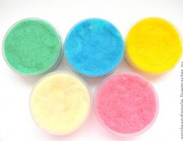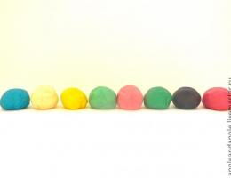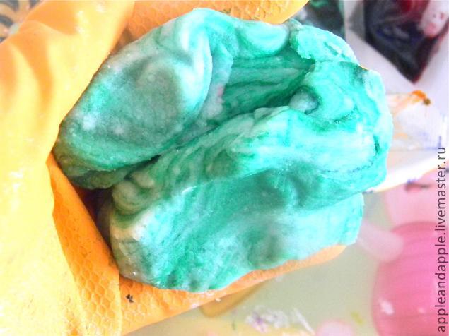 5.Теперь делим тесто на несколько частей и начинаем его окрашивать. Для этого надеваем перчатки и наливаем несколько капель красителя в углубление в тесте, перемешиваем. Добавляем еще краситель для получения нужной вам интенсивности цвета.