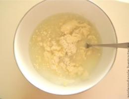 3.Сначала будут комки, но в горячей воде мука начнет завариваться и тесто будет густеть. Когда смесь станет не такой горячей, принимайтесь месить его руками.