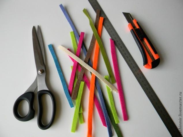 Для начала нарежьте фетр полосками шириной 8мм. Используйте ножницы или резак с линейкой.
