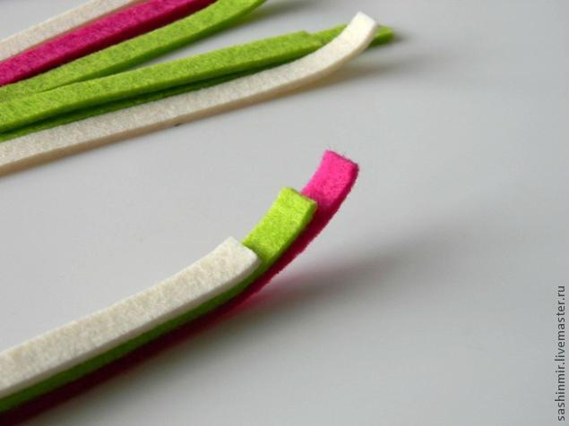 Возьмите 3 полоски фетра и сложите их как бы "ступеньками".