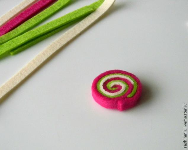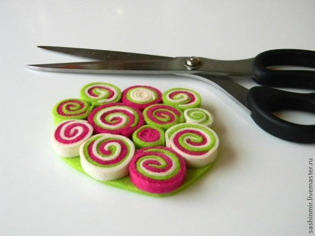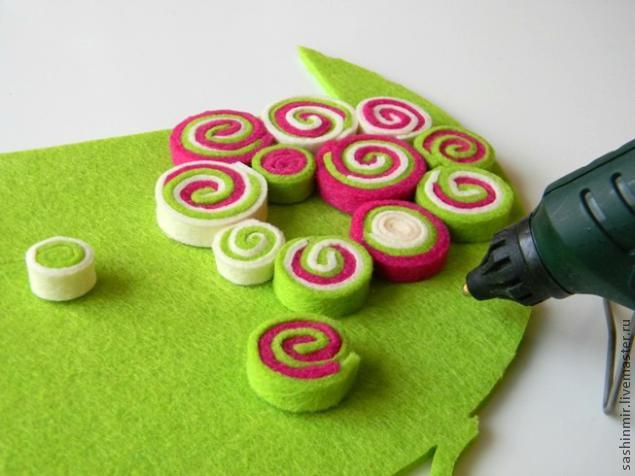 На листе фетра сложите "роллы" в композицию и начинайте приклеивать их поочередно термопистолетом.