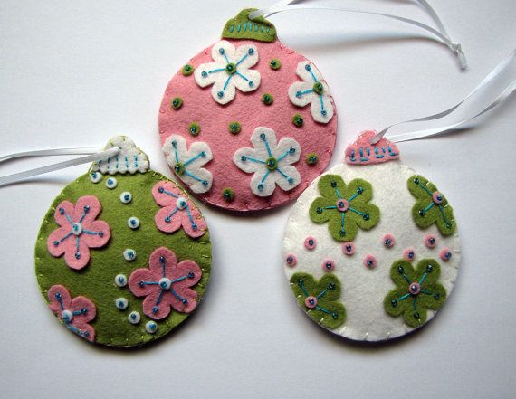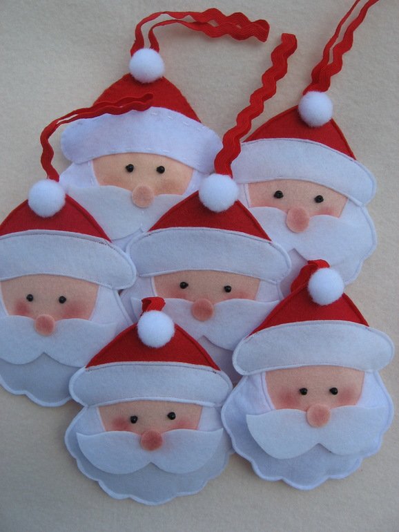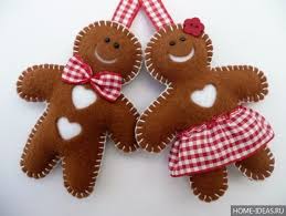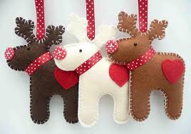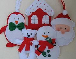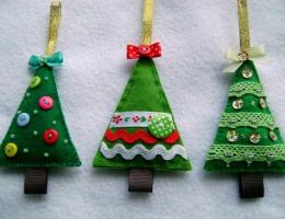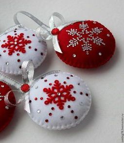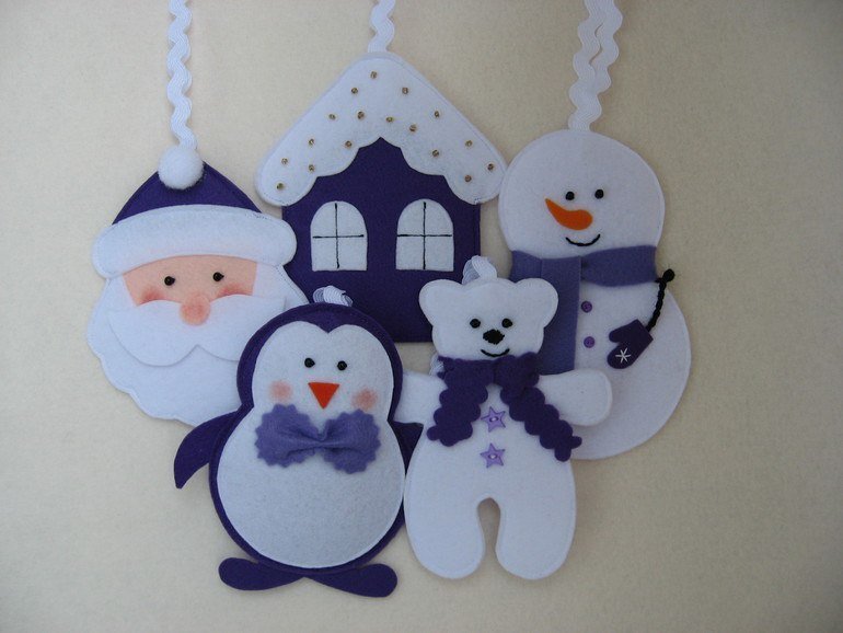 Можно сделать вместе с детьми елочные игрушки из фетра своими руками. Кроме того, игрушки из фетра станут приятным подарком для бабушек, дедушек и других родственников. Фетр – очень мягкий материал, приятный на ощупь, имеет массу расцветок, и что самое замечательное, его края не осыпаются и не требуют обработки. Елочные игрушки из фетра, выкройки которых могут быть любыми: мишки, олени, снеговики, деды Морозы, елки из фетра и прочие.
