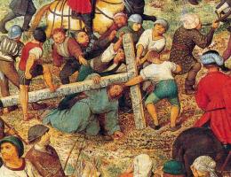 Композиционно Брейгель подчеркивает, выделяет, и место казни, и фигуру Христа, несущего крест, еще одним способом. Параллельно кресту высоко в светлом небе видны крылья ветряной мельницы (символ жизни), образующие такой же крест. А параллельно месту казни, окруженному кольцом людей, в темном небе виднеется еще одно "кольцо" - шест для колесования (символ смерти). Жертву, подозреваемую в проповеди протестантской доктрины, сначала жестоко избивали, а затем привязывали к колесу, поднимали на столб и так оставляли умирать. Обрывки одежды и ворон-падальщик, изображенные Брейгелем, показывают, что кровавая жертва была принесена совсем недавно.