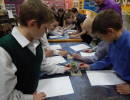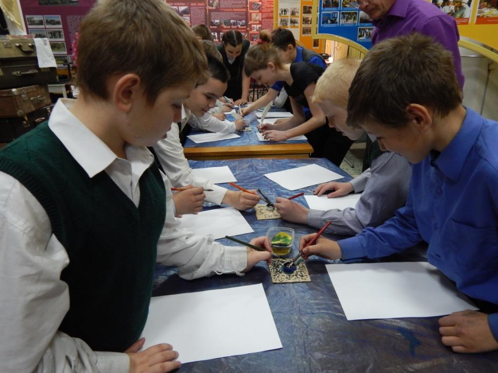 Юные посетители узнали, что на протяжении веков совершенствовались инструменты для письма. В более ранние периоды человек рукой и палкой стал рисовать на песке, заострённым камнем изображал рисунки на стенах пещер.