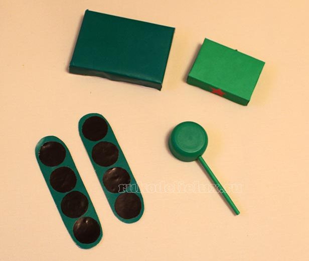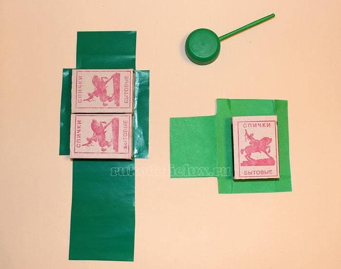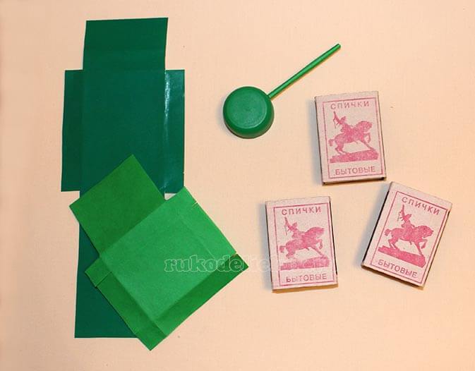 Для этой поделки нужно взять 3 спичечных коробка, 2 листа двусторонней зеленой бумаги, крышечку от бутылочки зеленого цвета и палочку от чупа-чупса (или любую трубочку), листы цветной бумаги черного и красного цвета. 1. Берем лист бумаги, кладем на нее две спичечные коробки и замеряем их длину и ширину. Коробки убираем, а от отмеченных линий отступаем на 1 см. и вырезаем обертку. 2. Вставляем в крышечку от бутылочки палочку от чупа-чупса или любую трубочку. 3. Обклеиваем получившимися заготовками – обертками спичечные коробки. Две спичечные коробки обклеим длинной заготовкой, а одну спичечную коробку короткой заготовкой. 4. Вырезаем гусеницы, по ширине чуть больше боковых узких сторон спичечных коробок. 5. Из листа бумаги черного цвета вырезаем 8 кружков и наклеиваем на гусеницы. 6. Из листа бумаги красного цвета вырезаем звезду для украшения поделки.